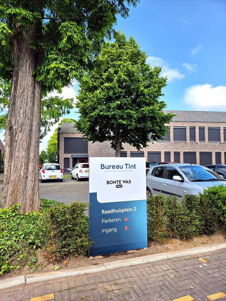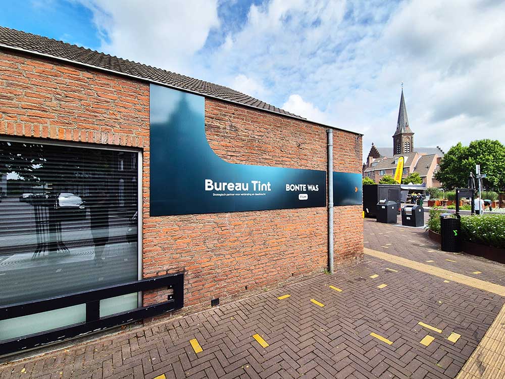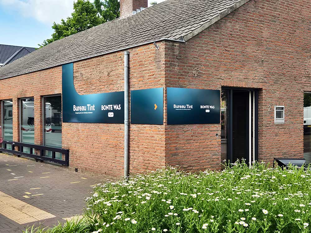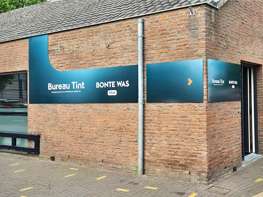 Voor Bureau Tint hebben wij de signing mogen verzorgen. Deze bestaat uit een gevelreclame van aluminiumsandwich panelen rechtstreeks geprint en voorzien van een glanscoating. Tevens hebben we een zuil geplaatst bij de parkeerplaats en de bedrijfsauto voorzien van contour gesneden teksten. Binnen zijn er 2 nieuwe doeken in bestaande textielframes gemonteerd.